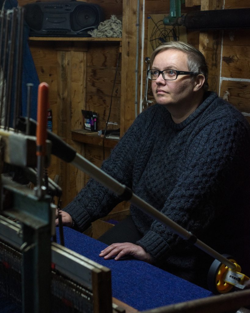 Rebecca (Taobh Tweeds) in her loom shed on a winter Saturday night.