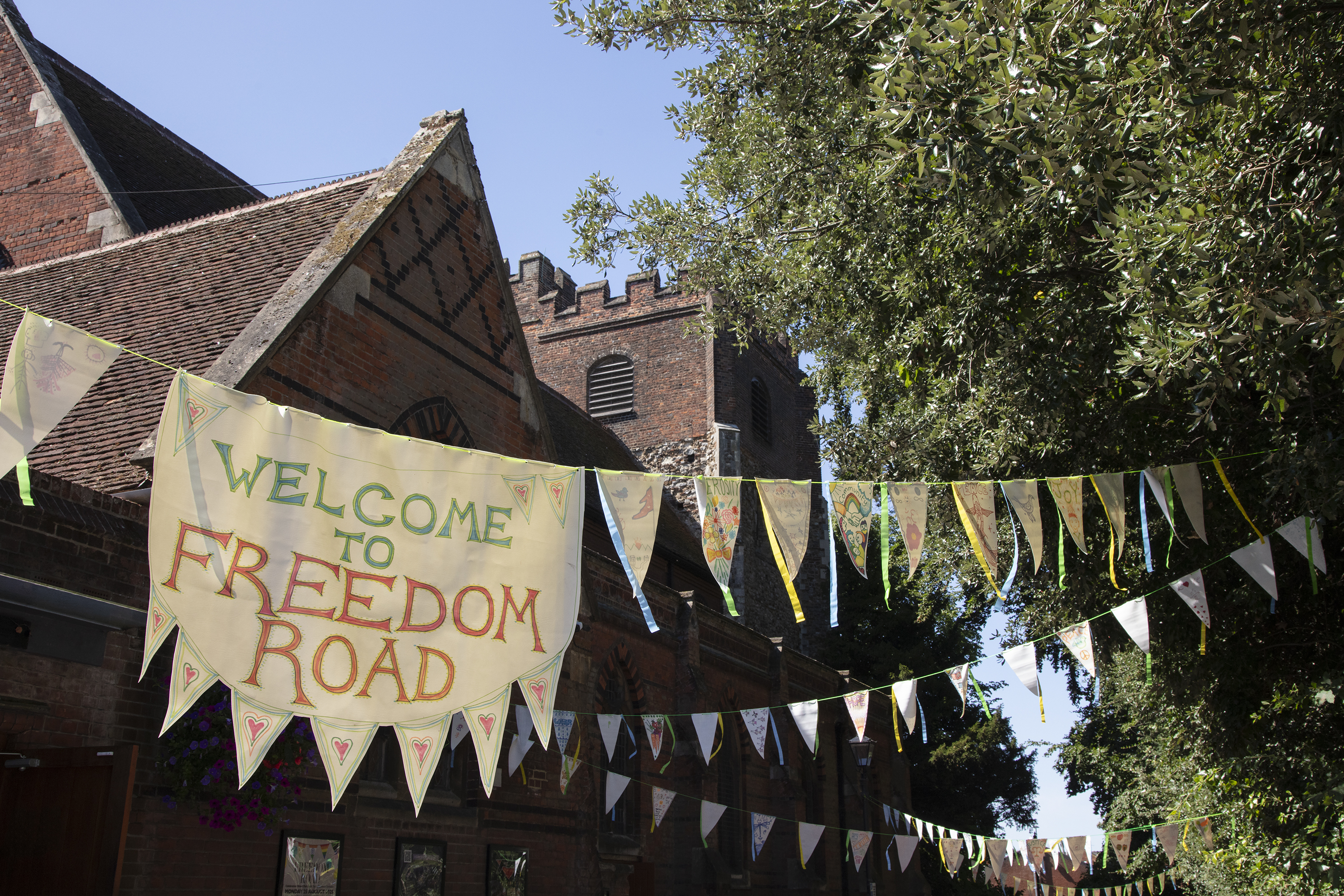‘Welcome to Freedom Road’, bunting created during the community group workshops with artist Clare Marsh, on display at the street party event.